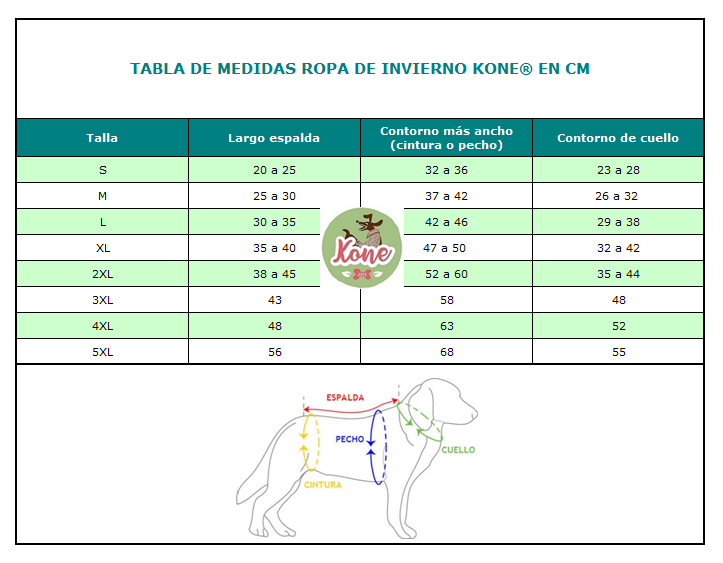 Usa la tabla de medidas referenciales que aparece al final de la página de inicio para elegir la talla adecuada de tu perro.